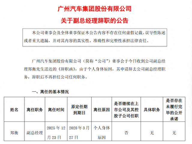 但值得一提的是,就在今年11月中旬,郑衡刚刚被广汽集团续聘为副总经理,原本任期到期时间为2028年3月。
